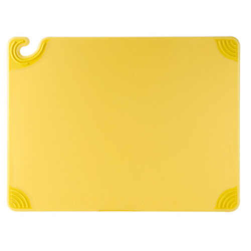 Cutting Board, 12″ x 18″ x 1/2″, anti-slip grip corners, food safety hook, integrated ruler, dishwasher safe, co-polymer, yellow, NSF